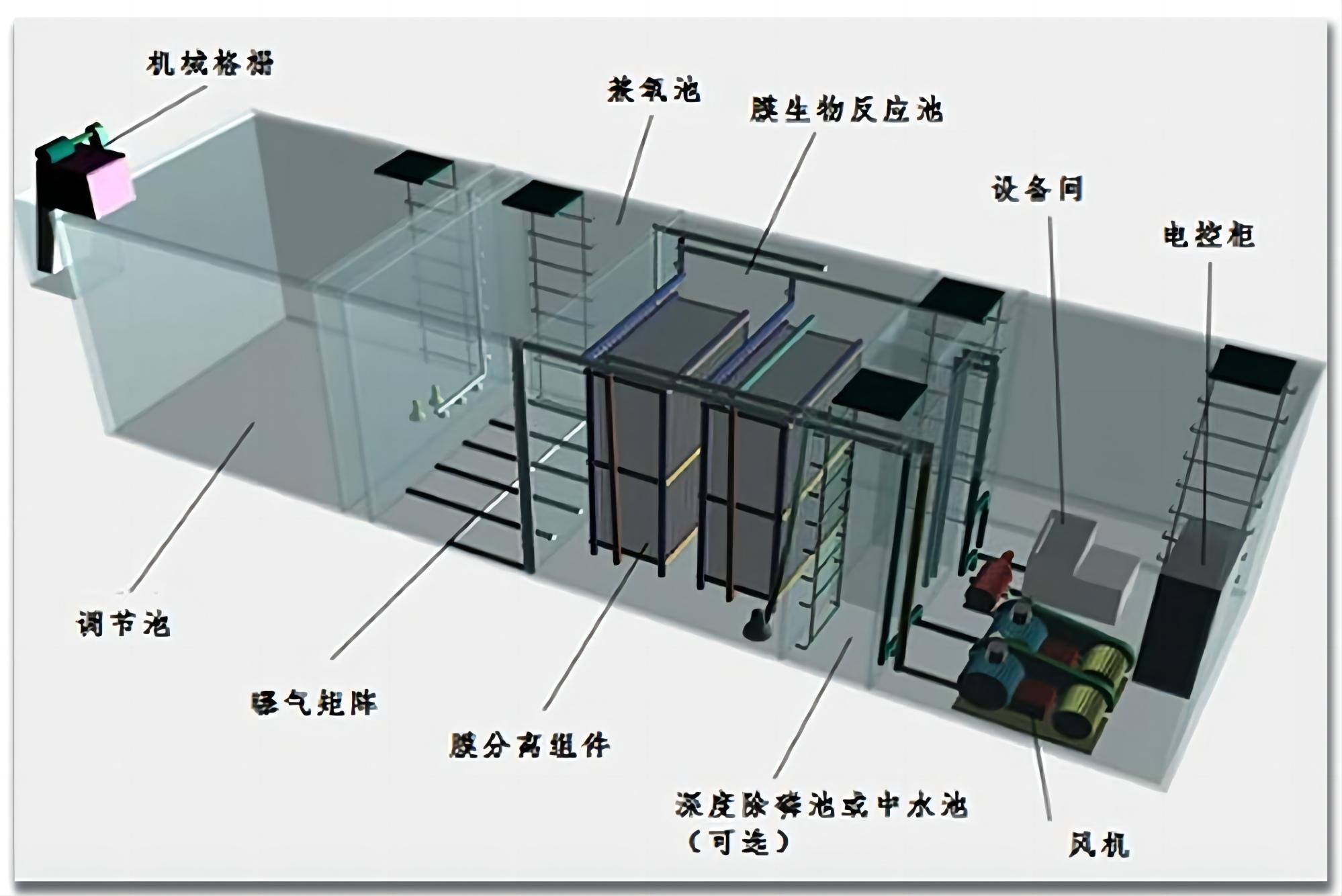 工藝原理:膜生物反應(yīng)器(MBR)工藝主要由兼氧池、MBR膜生物反應(yīng)池、深度除磷池等部分組成。通過好氧、厭氧菌的分解作用、中空纖維膜的截留作用、強(qiáng)化除磷填料的吸附作用等實(shí)現(xiàn)中水回用或達(dá)標(biāo)排放。